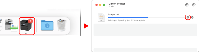 Klicka på skrivarikonen i Dock, välj dokumentet som ska avbrytas och klicka på [