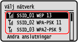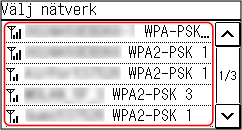 Sök efter en trådlös LAN-routern (åtkomstpunktmetoden) som du vill ansluta till och ange nätverksnyckeln. När du ansluter med åtkomstpunktmetoden anges följande autentiserings- och krypteringsmetoder: WEP-autentiseringsmetod: Öppet system Kryptering med WPA/WPA2: AES-CCMP eller TKIP anges automatiskt beroende på den valda trådlösa LAN-routern. Om du vill ange en annan autentiserings- eller krypteringsmetod ska du använda den manuella anslutningsmetoden. Ansluta till trådlöst LAN genom att ange inställningarna manuellt (manuell anslutningsmetod) |