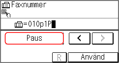 När du skickar fax till mottagare i utlandet anger du prefixet för utlandssamtal, landsnumret och faxnumret i nämnd ordning. Tryck på [Paus] mellan numren för att lägga till en paus.