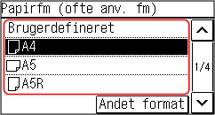 Hvis der er ilagt papir i liggende papirretning, skal du vælge [A5]. Hvis der er ilagt papir i stående papirretning, skal du trykke på [A5R].