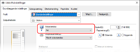 I [Sidestørrelse] på fanen [Grundlæggende indstillinger] skal du vælge papirstørrelsen for dokumentet.