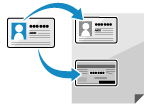 | | ID-korttikopio-toiminnon avulla voit kopioida ajokortin tai muun ID-kortin etu- ja takapuolen samalle paperiarkille 100 %:n suurennuksella. Tämä voidaan tehdä nopeasti käyttöpaneelin [Koti]-näytöstä tai valitsemalla  . Tämä on kätevää esimerkiksi kopioitaessa ID-kortteja vastaanotossa. |
