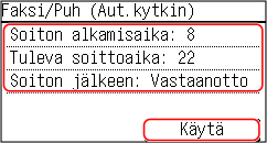 Jos [Faksi/Puhelin (Automaattinen kytkin)] on käytössä sen määrittämiseksi, onko saapuva puhelu faksi, voit määrittää myös asetukset, kuten soittoajan.