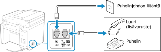 Yhdistä toimitettu puhelinjohto laitteen puhelinlinjaliitäntään (LINE) ja seinässä olevaan puhelinpistorasiaan.