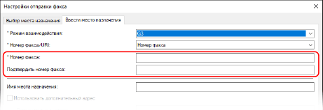 На вкладке [Ввести место назначения] введите номер факса. Когда можно ввести [Подтвердить номер факса], укажите тот же номер факса.