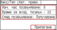 Задайте времето на звънене и действието при получаване на факс, и натиснете [Прилагане].