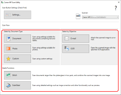 Щракнете върху [ScanGear], за да се изведе ScanGear MF и конфигурирайте разширените настройки за сканиране. За допълнителна информация щракнете върху [