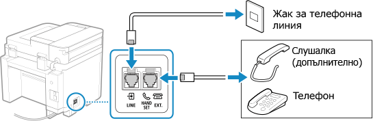 Използвайте предоставения телефонен кабел, за да свържете устройството към телефонната линия.