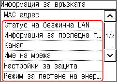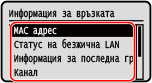 В допълнение към MAC адреса и информацията за свързване на безжичната LAN, когато устройството е свързано към безжичната LAN мрежа, можете също така да видите и настройките за защита.