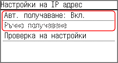 5 | Изберете [Ръчно получаване] и натиснете .Показва се екранът за въвеждане на IP адрес. |