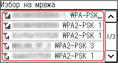 Потърсете безжичен LAN маршрутизатор (точка за достъп), към който да се свържете, и въведете мрежовия ключ. Когато се свързвате чрез метода за настройка с точка за достъп, се задават следните методи за удостоверяване и криптиране: Метод за WEP удостоверяване: Отворена система Криптиране за WPA/WPA2: AES-CCMP или TKIP се настройва автоматично в зависимост от избрания безжичен LAN маршрутизатор. За да посочите различен метод за удостоверяване или криптиране, използвайте метода за ръчна настройка, за да се свържете. Свързване към безжична LAN мрежа чрез задаване на подробни данни (метод за ръчна настройка) |