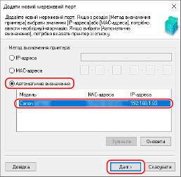 Якщо апарат не відображається, клацніть [Refresh]. Якщо він усе одно не відобразився, виберіть [IP address] або [MAC address], введіть IP адресу або MAC адресу апарата, після чого клацніть [Next].
