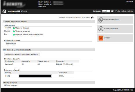 Když se přihlásíte do vzdáleného uživatelského rozhraní, zobrazí se stránka portálu (domovská stránka vzdáleného uživatelské rozhraní). Odsud můžete kontrolovat provozní stav zařízení, zobrazovat různé informace a měnit nastavení pomocí operací s tlačítky.
