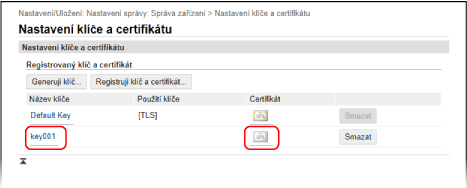 Klikněte na název klíče (nebo ikonu certifikátu) v nabídce [Registrovaný klíč a certifikát] na obrazovce [Nastavení klíče a certifikátu] a zobrazte podrobnosti certifikátu.
