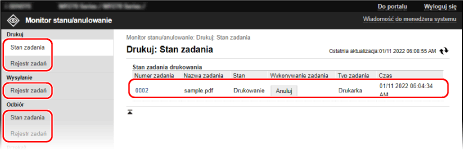 Jeśli zalogowano w trybie administratora, wyświetlany jest status drukowania wszystkich zadań.