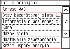 Okrem adresy MAC a informácií o pripojení k bezdrôtovej sieti LAN, keď je zariadenie pripojené k bezdrôtovej sieti LAN, môžete zobraziť aj nastavenia zabezpečenia.