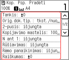 Be pagrindinių kopijavimo parametrų, aparate taip pat galima nustatyti dvipusio kopijavimo, vaizdo kokybės koregavimo ir kitus parametrus pagal originalą ir jūsų tikslą. Parametrai konfigūruojami kopijavimo ekrane.