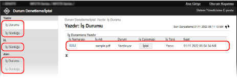 Uzak Kullanıcı Arabirimi'nde Durum Denetleme/İptal kısmından bir işlevin durumunu ve günlüklerini, makinenin çalışma durumunu ve hata bilgilerini kontrol edebilirsiniz.
