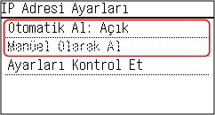 Mevcut Durumda Ayarlı IP Adresini Kontrol Etme3. adımdaki ekranda, mevcut IP adresi ayarını kontrol etmek için [Ayarları Kontrol Et] öğesine basın. IP adresi "0.0.0.0" olarak görüntüleniyorsa doğru şekilde yapılandırılmamış demektir.