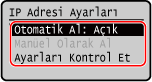 Normalde, [Açık] öğesine ayarlayın. Öncelik DHCP ile tahsis edilen IP adresine verilse de DHCP'den yanıt alınmadığı takdirde Otomatik IP kullanılır.