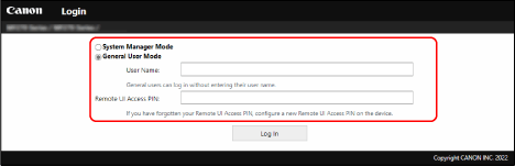 Επιλέξτε [System Manager Mode] ή [General User Mode] και εισαγάγετε τα στοιχεία που απαιτούνται για τη σύνδεση.