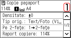 * Când utilizați funcția Copie pașaport pentru a efectua copii, raportul de copiere este setat automat în funcție de formatul de hârtie utilizat la copiere și de numărul de pașapoarte care se combină. Puteți apăsa pe [Raport copiere] pentru a modifica manual raportul de copiere.