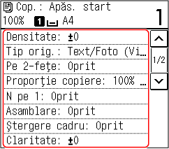 În afara setărilor de copiere de bază, aparatul dispune și de setări pentru copiere pe 2 fețe, pentru reglarea calității imaginii și alte setări, în funcție de original și de scopul urmărit. Utilizați ecranul de copiere pentru a configura aceste setări.