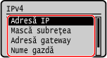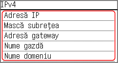 Puteți vizualiza setarea adresei IP setate la aparat, precum adresa IPv4 și adresa IPv6.