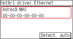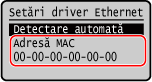Puteți vizualiza adresa MAC setată la aparat atunci când aparatul este conectat la rețeaua LAN cu fir.