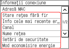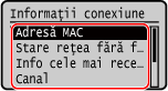 În afara adresei MAC și a informațiilor de conexiune ale rețelei LAN wireless când aparatul este conectat la rețeaua LAN wireless, puteți vizualiza și setările de securitate.