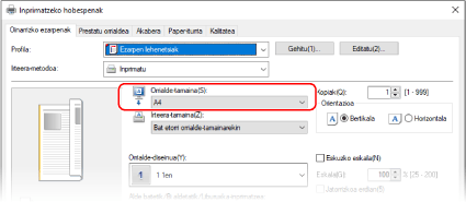 Inprimatzeko aukeren [Paper Size] aukeran, hautatu dokumentuaren paper-tamaina.
