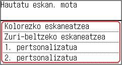 Eskaneatutako datuen formatua, ordenagailuan gordetzeko kokapena eta bestelako ezarpenak eskaneatze-ezarpen bakoitzerako ezartzen dira. Hautatutako eskaneatze-ezarpenaren arabera eskaneatzen da originala.