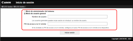 Para usar la IU remota, introduzca la dirección IP del equipo en un navegador web en un ordenador e inicie sesión con el modo de administrador del sistema o el modo de usuario general. Las funciones disponibles con la IU remota varían en función del modo en el que haya iniciado sesión.