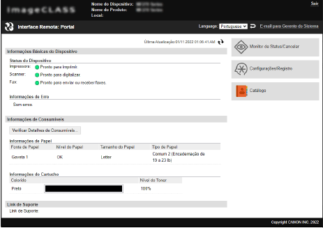 Quando você faz login na UI Remota, a página do Portal (página inicial da UI Remota) é exibida. Daqui, você pode verificar o status das operações da máquina, visualizar várias informações e alterar as configurações de operação dos botões.