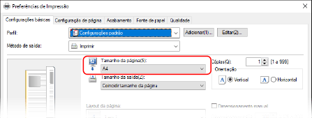 Em [Tamanho da saída], selecione o tamanho de papel para imprimir. O documento é ampliado ou reduzido para coincidir com o tamanho de papel em [Tamanho da saída].