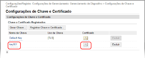 Visualizando e verificando as informações detalhadas de um certificado registradoClique no nome da chave (ou ícone de certificado) em [Chave e Certificado Registrados] na tela [Configurações de Chave e Certificado] para exibir os detalhes do certificado. Na tela de detalhes do certificado, clique em [Verificar Certificado] para verificar se o certificado é válido. Quando a chave e o certificado não podem ser excluídosVocê não pode excluir uma chave e um certificado em uso. Desative a função que está sendo usada ou exclua-os após alternar para outra chave e certificado. |