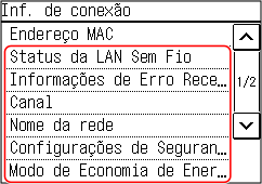 Além do endereço MAC e das informações de conexão da LAN sem fio quando a máquina está conectada à LAN sem fio, você também pode visualizar as configurações de segurança.