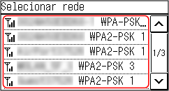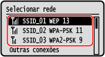 Procure por um roteador de LAN sem fio (ponto de acesso) ao qual se conectar e insira a chave de rede. Quando você se conecta com o método de configuração do ponto de acesso, os seguintes métodos de autenticação e criptografia são definidos: Método de autenticação WEP: sistema aberto Criptografia para WPA/WPA2: AES-CCMP ou TKIP é definido automaticamente de acordo com o roteador de LAN sem fio selecionado. Para especificar um método de autenticação ou criptografia diferente, use o método de configuração manual para conectar. Conectando a uma LAN sem fio por meio da configuração de detalhes (método de configuração manual) |