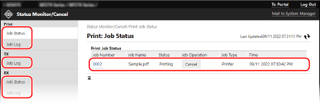 Klik [Cancel] di [Job Operation] untuk memadamkan data cetakan untuk kerja yang mencetak atau menunggu.