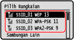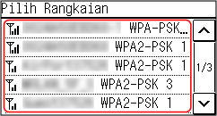 Cari penghala LAN wayarles (titik akses) yang akan disambungkan, dan masukkan kekunci rangkaian. Apabila anda menyambung dengan kaedah penyediaan titik akses, kaedah pengesahan dan penyulitan berikut ditetapkan: Kaedah pengesahan WEP: Sistem Terbuka Penyulitan untuk WPA/WPA2: AES-CCMP atau TKIP ditetapkan secara automatik mengikut penghala LAN wayarles yang dipilih. Untuk menetapkan kaedah pengesahan atau penyulitan yang berbeza, gunakan kaedah penyediaan manual untuk menyambung. Menyambungkan ke LAN Wayarles dengan Menetapkan Butiran (Kaedah Persediaan Manual) |