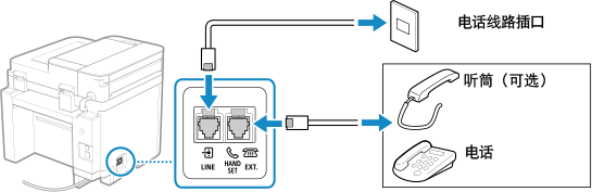 将随附的电话线连接到机器上的电话线路插口和墙壁上的电话线路接口。