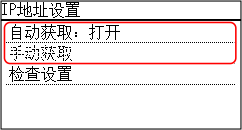 5 | 选择 [手动获取],然后按下 。将显示 IP 地址输入屏幕。 |