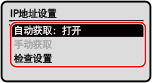 2 | 根据需要配置自动获取设置。 [选择通信协议] 一般设置为 [DHCP]。但是,当在无法使用 DHCP 的环境中设置 [DHCP] 时,机器会继续在网络中确认自动获取功能,造成不必要的通信。如果不使用 DHCP,请将此项设置为 [关闭]。 [自动获取IP] 一般设置为 [打开]。虽然优先考虑使用 DHCP 来分配 IP 地址,但如果 DHCP 没有响应,则会使用自动 IP 方式。 |