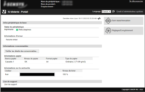 Lorsque vous vous connectez à l'interface utilisateur distante, la page Portail (page d'accueil de l'interface utilisateur distante) s'affiche. Depuis cette page, vous pouvez vérifier l'état d'utilisation de l'appareil, afficher diverses informations et changer les paramètres au moyen de boutons.