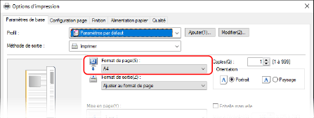 Dans l’onglet [Format de page] de l’écran [Paramètres de base], sélectionnez le format de papier du document.