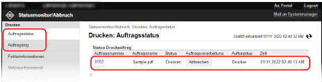 Wenn Sie sich im Administratormodus angemeldet haben, wird hier der Druckstatus für alle Aufträge angezeigt.