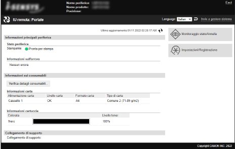 Quando si accede alla IU remota, viene visualizzata la pagina portale (prima pagina della IU remota). Da qui è possibile verificare lo stato operativo della macchina, visualizzare varie informazioni e modificare le impostazioni mediante l’utilizzo dei pulsanti.