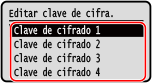4 | Seleccione una clave de cifrado que no esté registrada y pulse .![]() Aparece la pantalla de introducción de la clave de cifrado. |