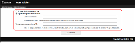 Om Externe UI te gebruiken, voert u het IP-adres van het apparaat in bij een webbrowser op een computer, en logt u in met de Modus Systeembeheerder of Modus Algemene gebruiker. De beschikbare functies bij Externe UI verschillen per modus waarbij u hebt ingelogd.