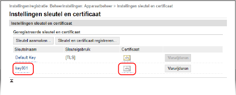 Gedetailleerde informatie van een geregistreerd certificaat bekijken en verifiërenKlik op de sleutelnaam (of op het certificaat-pictogram) in [Geregistreerde sleutel en certificaat] op het scherm [Instellingen sleutel en certificaat] om de certificaatdetails weer te geven. Op het scherm voor certificaatdetails klikt u op [Certificaat verifiëren] om te verifiëren dat het certificaat geldig is. Als u sleutel en certificaat niet kunt verwijderenU kunt een sleutel en certificaat die worden gebruikt, niet verwijderen. Schakel de gebruikte functie uit, of verwijder deze nadat u bent overgestapt op een andere sleutel en certificaat. |